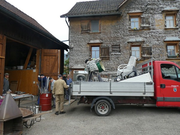 Bei der Abrechnung ergibt dies einen deutlich höheren Ertrag als wenn gemischte Metalle abgegeben werden. Das Trennen der Gegenstände von Plastikteilen und legierten Teilen bedeutet aber einen grossen Arbeitsaufwand. Mit Trennscheiben, Hammern und anderen Werkzeugen sind die Männer voller Konzentration und vollem Einsatz an der Arbeit. Der Znüni und das Mittagessen werden denn auch sehr geschätzt. Dieses Jahr wurde der Znüni als Dank für die saubere Sortierung von der Firma Thommen spendiert.
