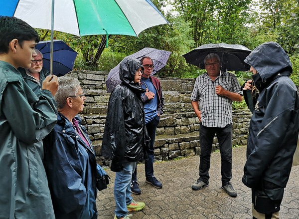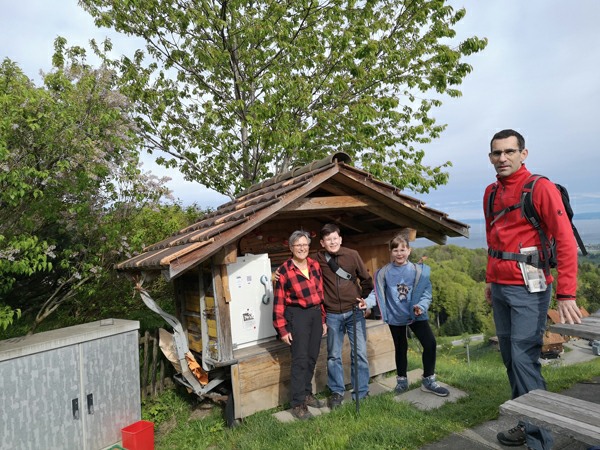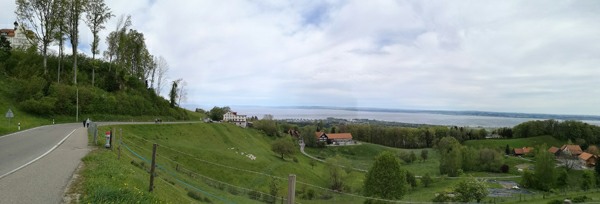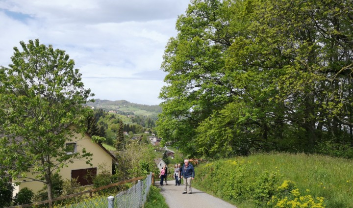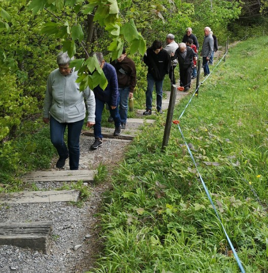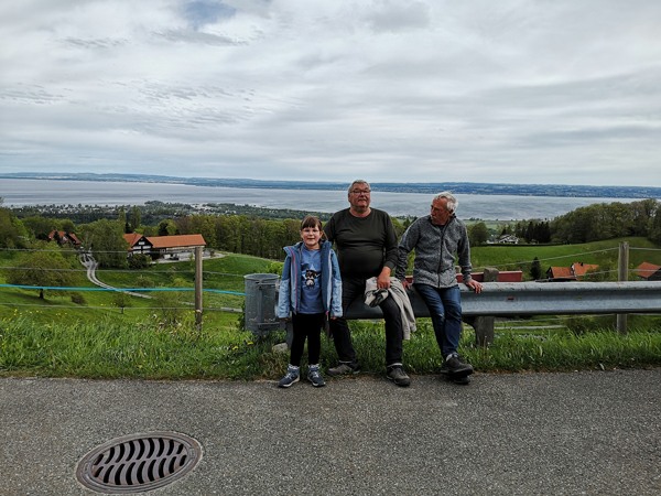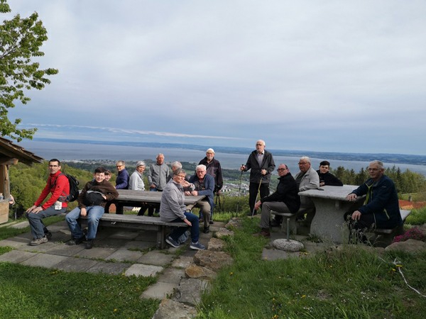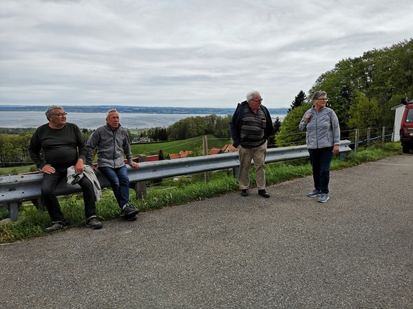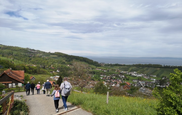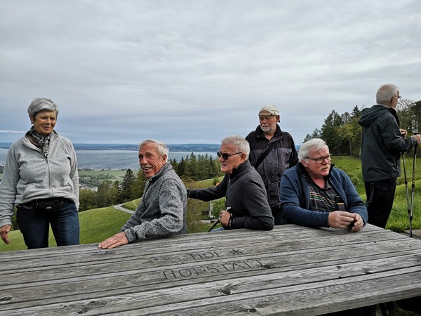 In Walzenhausen angekommen, nahmen wir die erste Etappe des Witzwanderweges unter die Füsse. Schon bald standen wir vor einer langen, steilen Treppe. Mit dem Auftrag, die Treppenstufen zu zählen, wurde diese Herausforderung konzentriert und im Nu überwunden. Da alle (fast) das richtige Resultat zählten, zirka 130 Stufen, durften sich alle mit Kaffee und Kuchen stärken beim Hofladen Hostet. Wir genossen die wunderbare Aussicht von diesem einmaligen Rastplatz aus weit über den Bodensee.