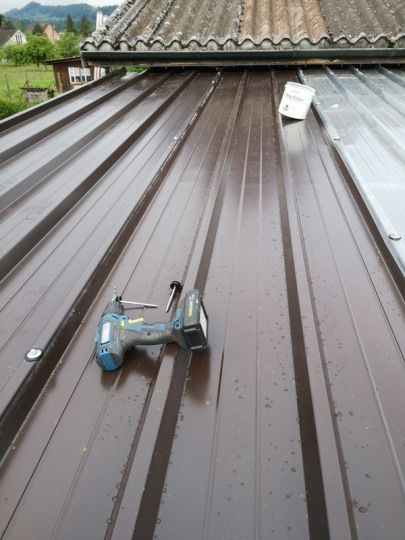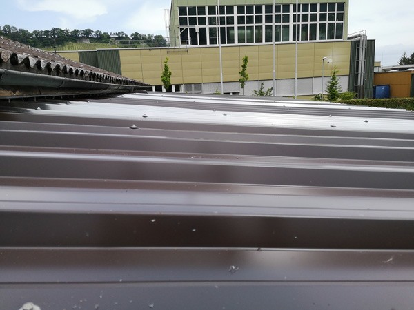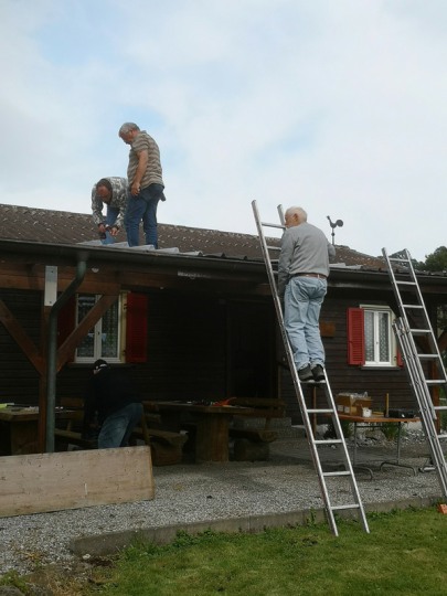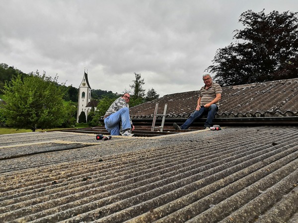 Zuerst wurden die alten Dachpaneelen entfernt. Anschliessend konnten neue Paneele montiert werden. Die Paneele wurden von Urs Hauser, Hansruedi Fenk und Kurt Huber hochgestemmt. Auf dem Dach wurden sie von den Monteuren Ueli Kuhn und Stefan Dornbierer abgenommen und montiert.